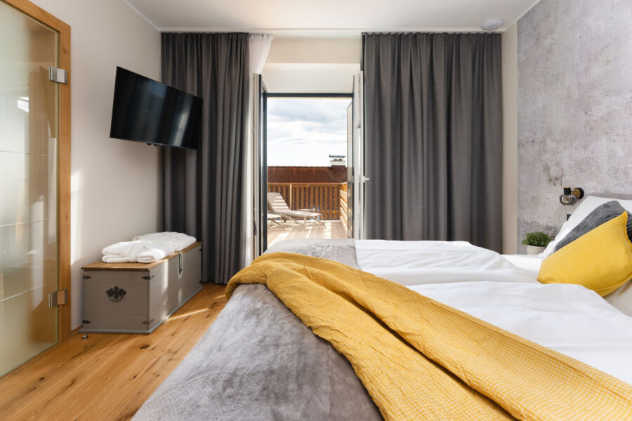Unsere Suiten bieten erholsame Momente: Entspannen Sie im privaten Whirlpool und genießen Sie den luxuriösen Komfort mit atemberaubender Aussicht auf der herrlichen zimmereigenen Sonnenterrasse.