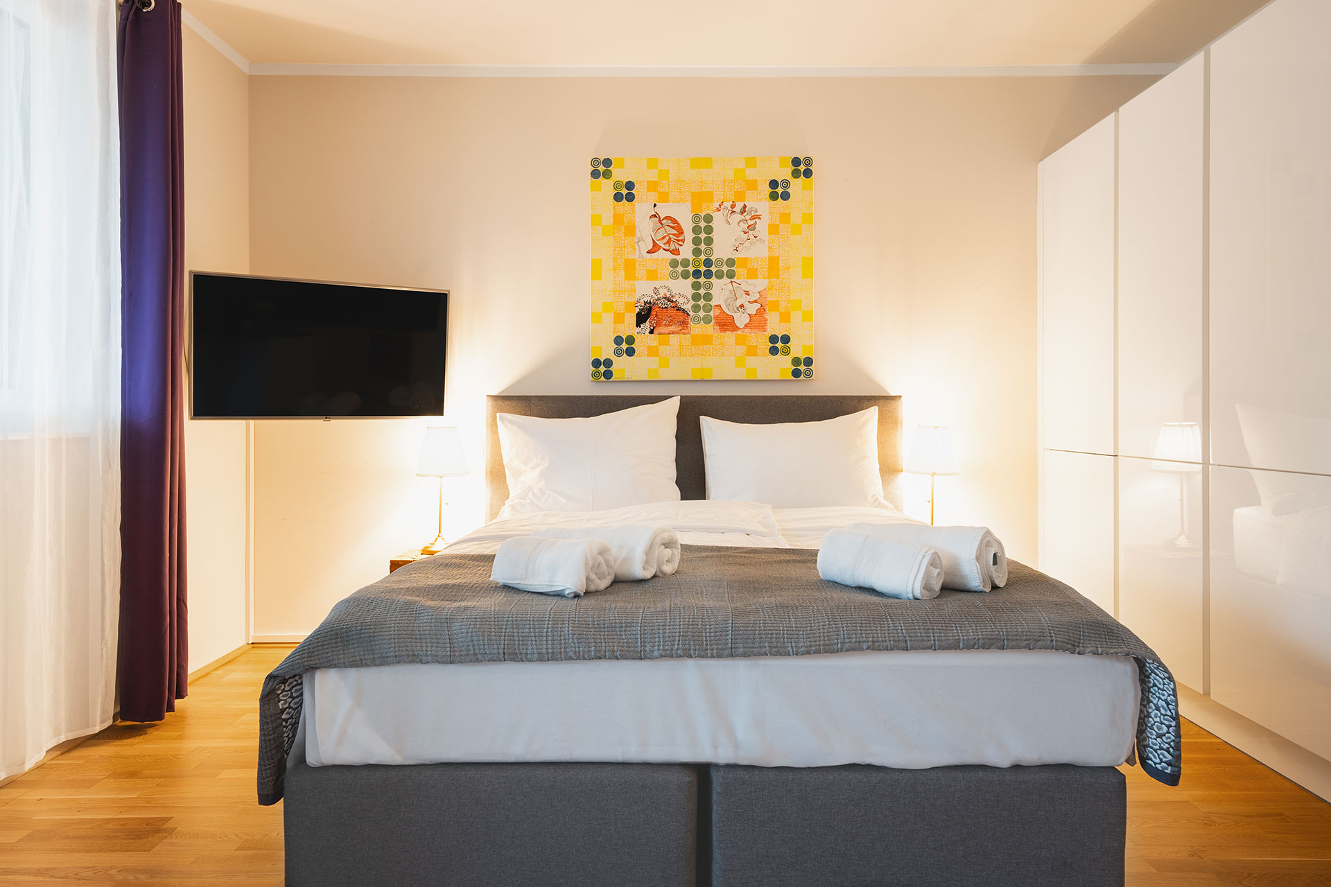 Dieses Appartement verfügt über ein großes gemütliches Wohn-/Esszimmer, mit einem grossen Esstisch und einem Komfortsofa welches sich auch schnell als Schlafsofa umbauen lässt, so dass bis zu 3 Personen in dem Appartment Platz finden. Ein SAT-Fernseher, welcher es ermöglicht ASTRA-Kanäle zu empfangen und zu schauen, ein Radio und WLAN sind ebenfalls vorhanden. Das Schlafzimmer mit Doppelbett verfügt über ein Swiss-Flex Gesundheitsschlafsystem.