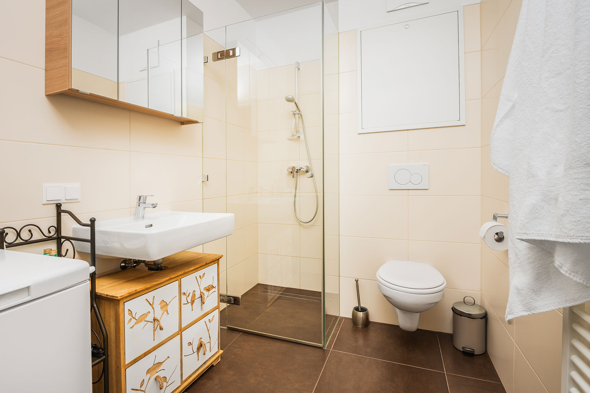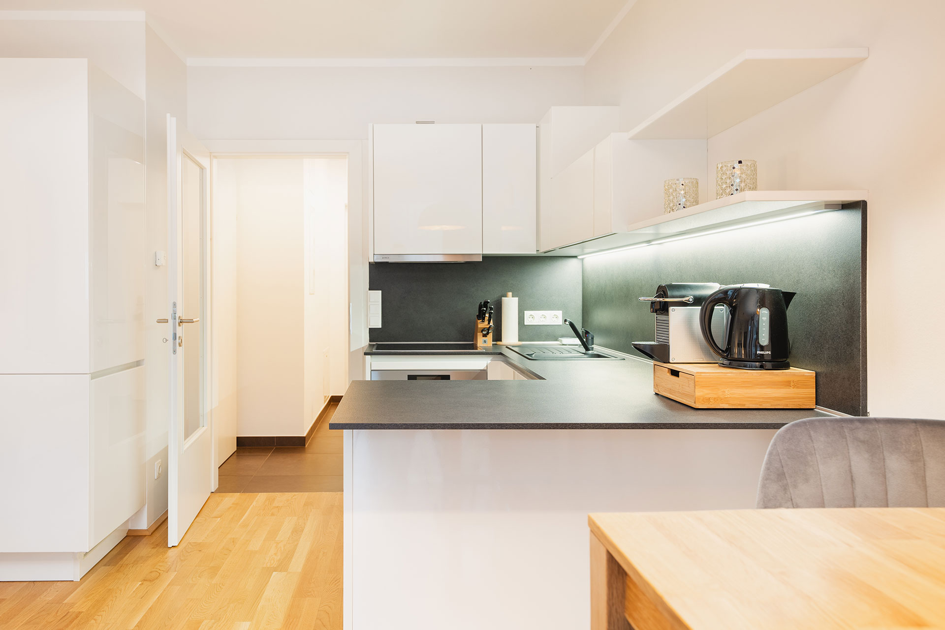 Die Küche ist voll eingerichtet und verfügt über ein 4-Platten-Cerankochfeld, Backofen, Geschirrspüler, Nespresso-Kaffemaschine, Kühlschrank und alles was man im Urlaub braucht. Das Duschbad verfügt über eine begehbare Dusche und WC. Haartrockner, Handtücher und Bademäntel sind vorhanden.