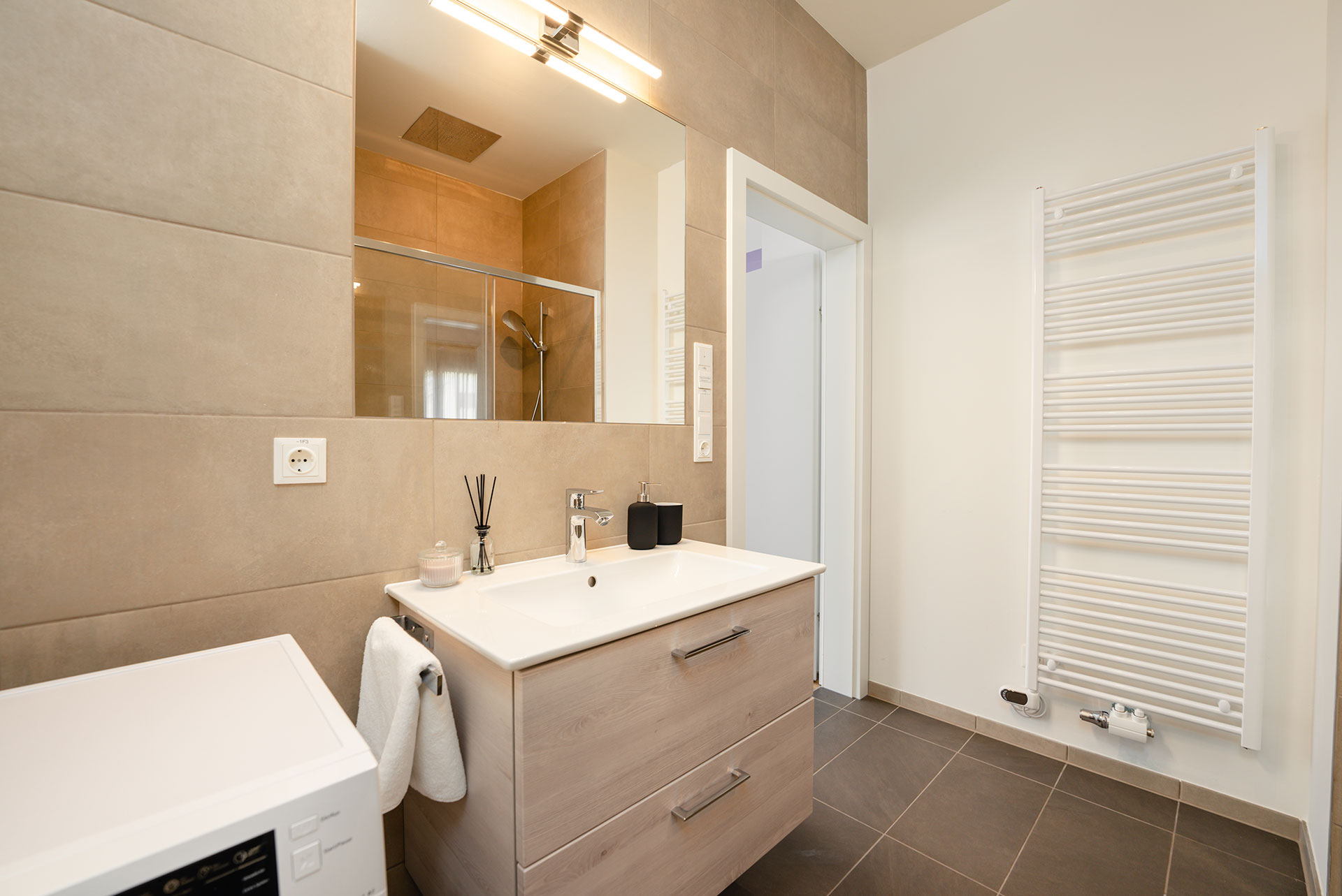 Die Küche ist voll eingerichtet und verfügt über ein 4-Platten-Cerankochfeld, Backofen, Geschirrspüler, Nespresso-Kaffemaschine, Kühlschrank und alles was man im Urlaub braucht. Das Duschbad verfügt über eine begehbare Dusche und WC. Haartrockner, Handtücher und Bademäntel sind vorhanden.