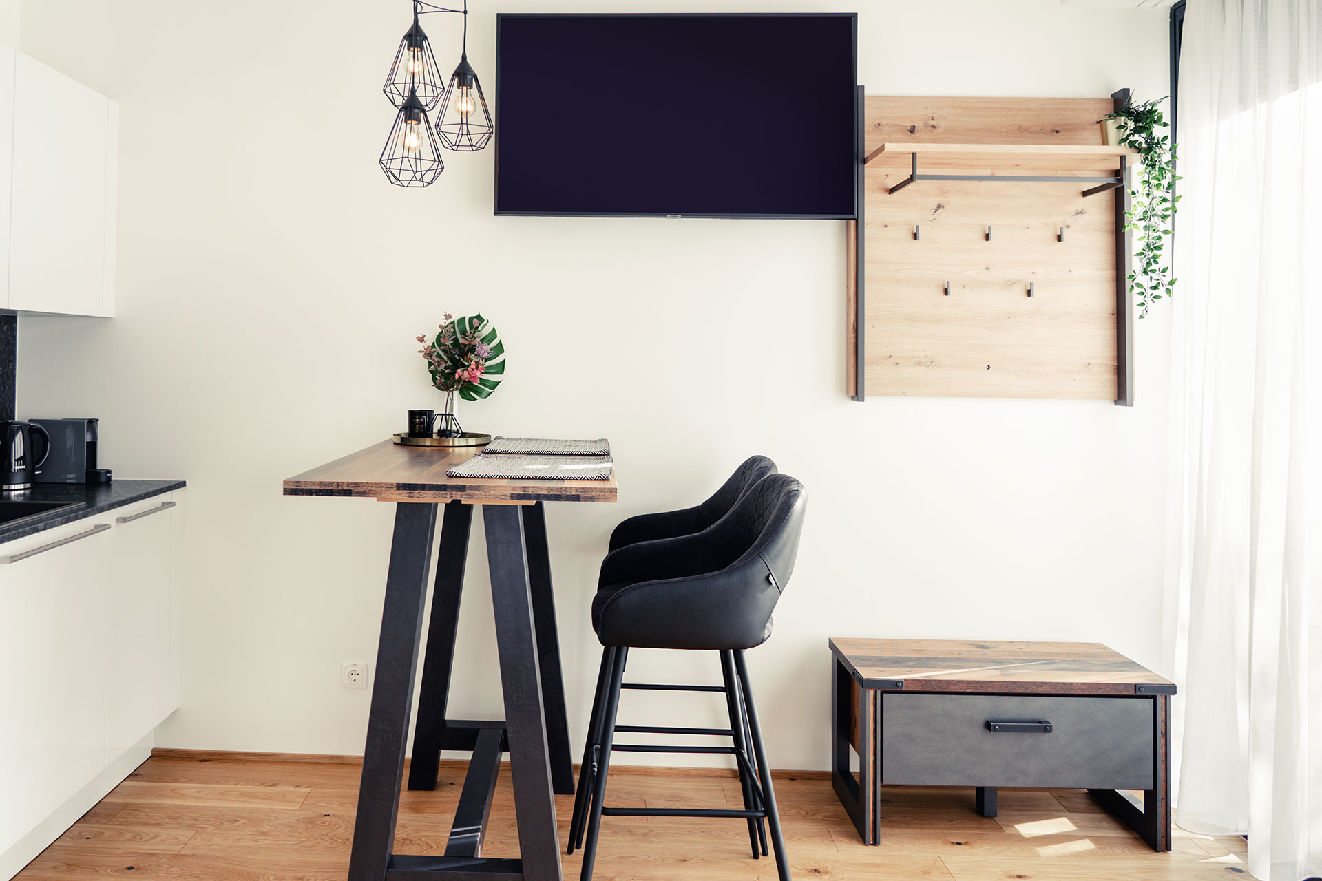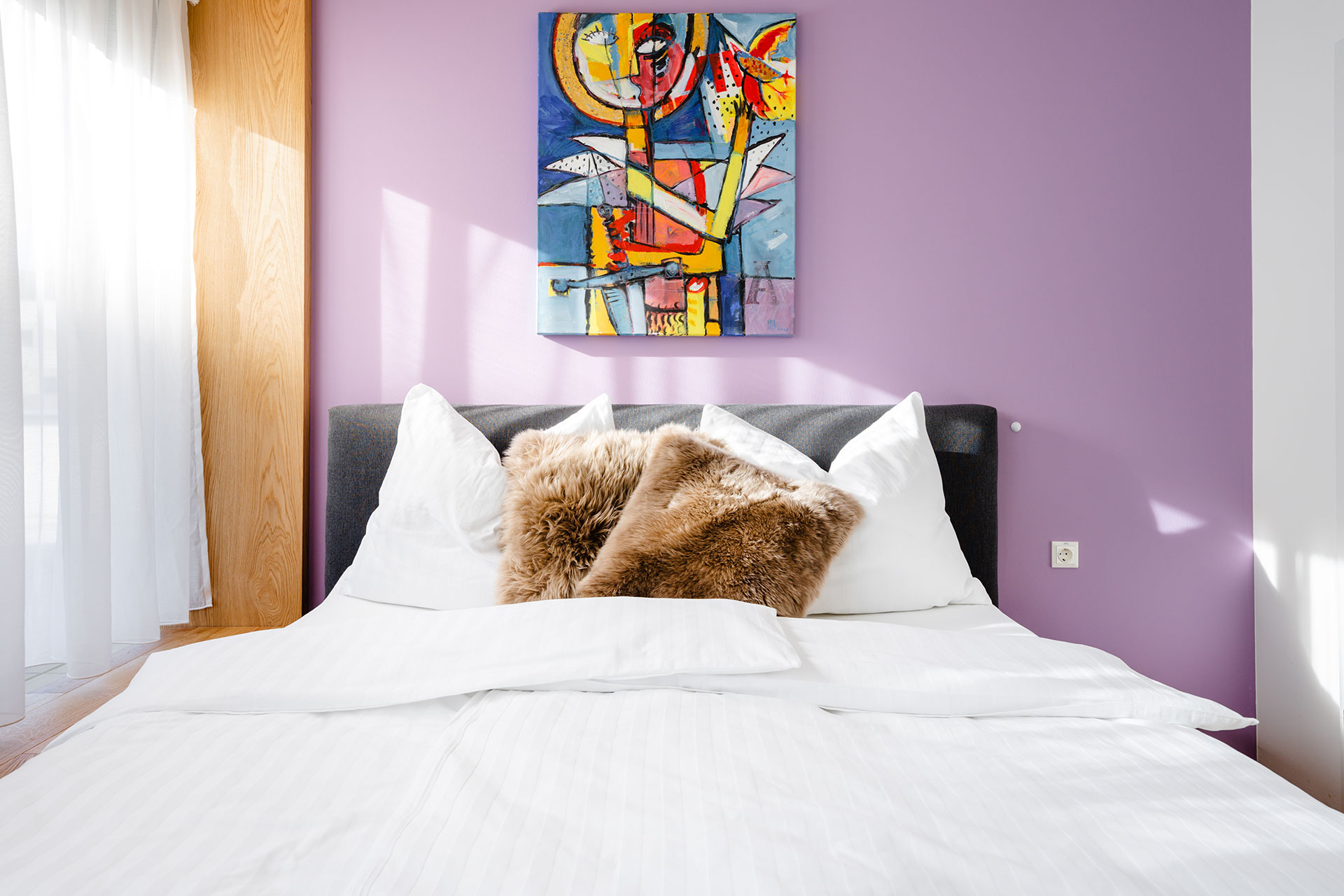 Dieses Appartement verfügt über ein großes gemütliches Wohn-/Esszimmer, mit einem grossen Esstisch und einem Komfortsofa welches sich auch schnell als Schlafsofa umbauen lässt, so dass bis zu 3 Personen in dem Appartment Platz finden. Ein SAT-Fernseher, welcher es ermöglicht ASTRA-Kanäle zu empfangen und zu schauen, ein Radio und WLAN sind ebenfalls vorhanden. Das Schlafzimmer mit Doppelbett verfügt über ein Swiss-Flex Gesundheitsschlafsystem.