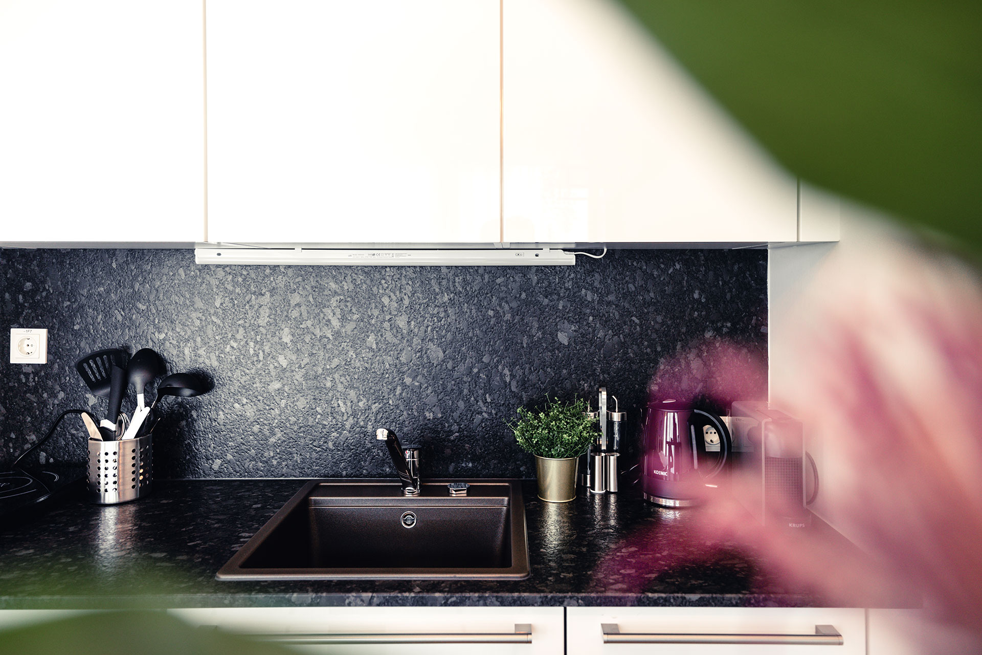 Die marokkanischen Schnitzarbeiten runden das gehobene Ambiente im Schlafzimmer ab. Vom Schlafzimmer gelangen Sie direkt zum eigenen Wasserfall mit Biotop – ein lauschiges Plätzchen das zum Träumen und Verweilen einlädt. Die modern eingerichtete Küche verfügt über Kühlschrank, 4 Platten Cerankochfeld, Backofen, Edelstahldunstabzugshaube, Geschirrspüler, Nespresso Kaffeemaschine, Toaster und alles was man im Urlaub so braucht. Außerdem steht Ihnen ein schönes Dusch-Badezimmer, mit Handtüchern, Bademantel und Haartrockner zur Verfügung, von hier aus haben Sie einen direkten Zugang zum Wellnessbereich.
