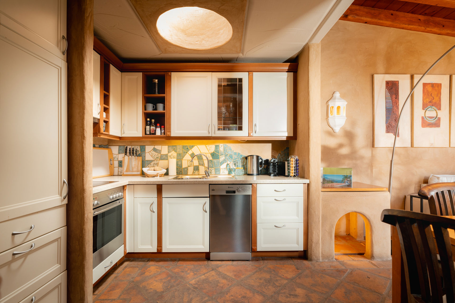 Die marokkanischen Schnitzarbeiten runden das gehobene Ambiente im Schlafzimmer ab. Vom Schlafzimmer gelangen Sie direkt zum eigenen Wasserfall mit Biotop – ein lauschiges Plätzchen das zum Träumen und Verweilen einlädt. Die modern eingerichtete Küche verfügt über Kühlschrank, 4 Platten Cerankochfeld, Backofen, Edelstahldunstabzugshaube, Geschirrspüler, Nespresso Kaffeemaschine, Toaster und alles was man im Urlaub so braucht. Außerdem steht Ihnen ein schönes Dusch-Badezimmer, mit Handtüchern, Bademantel und Haartrockner zur Verfügung, von hier aus haben Sie einen direkten Zugang zum Wellnessbereich.