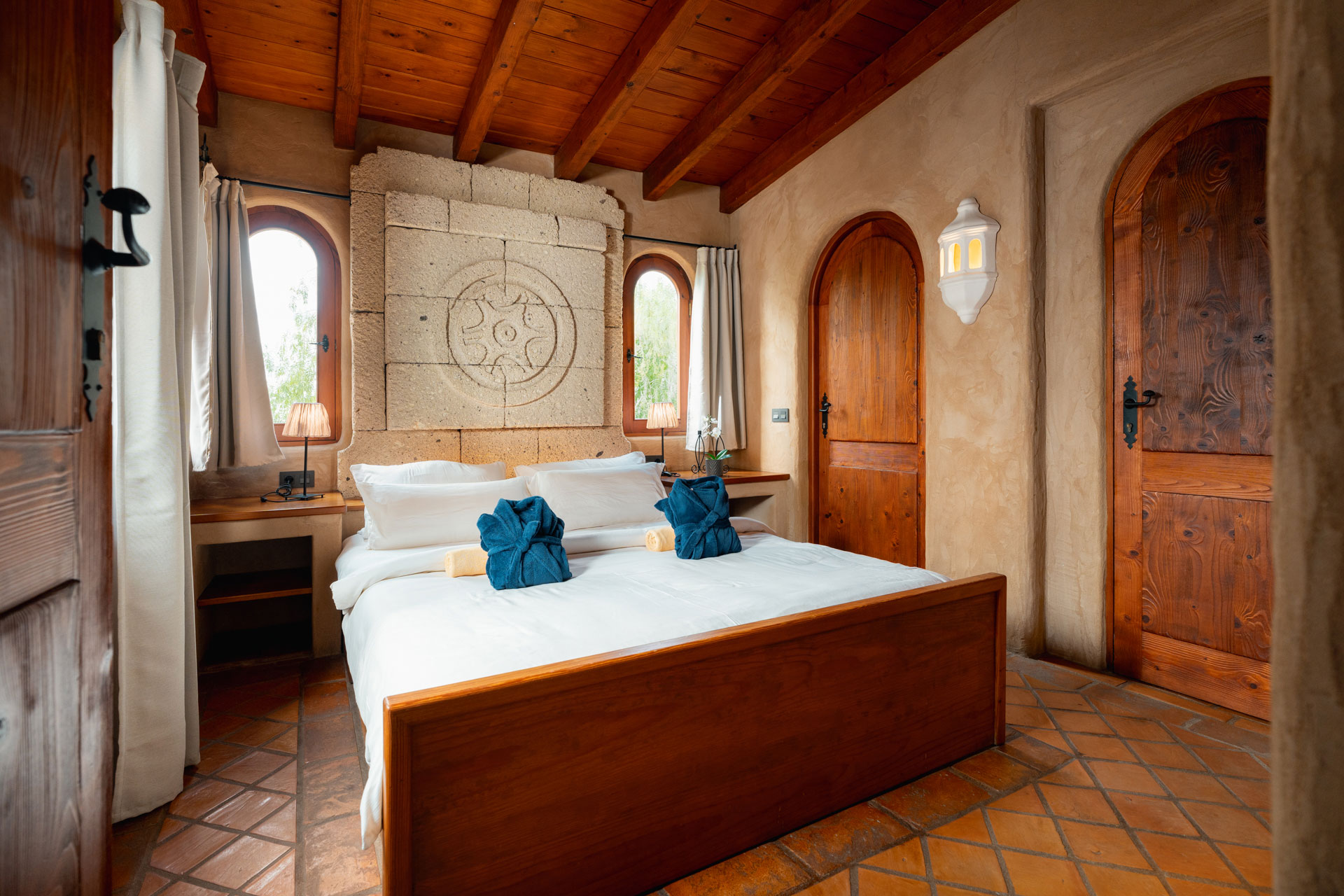 Das „El Teide“ ist die Hochzeitssuite / das Hochzeitspenthaus im „El Refugio“. Vom riesigen Panoramafenster im Schlafzimmer aus sehen Sie den „El Teide“ – den höchsten Berg Spaniens und geniessen einen fantastischen Blick auf das Meer. Der Blick auf die gesamte Nordküste, und deren Lichtermeer bei Nacht ist eine perfekte Untermalung für romantische Stunden. Das großzügige Schlafzimmer verfügt über ein Doppelbett samt Swiss-Flex-Gesundheitsschlafsystem und ein hochwertiges Sofa. Die marokkanischen Schnitzarbeiten runden das gehobene Ambiente in dem Wohn- / Schlafzimmer ab. Ein Smart SAT-TV, ermöglicht den Empfang der ASTRA-Fernseh- und Radiokanäle (u.a. auch einige englisch und französisch sprachige).