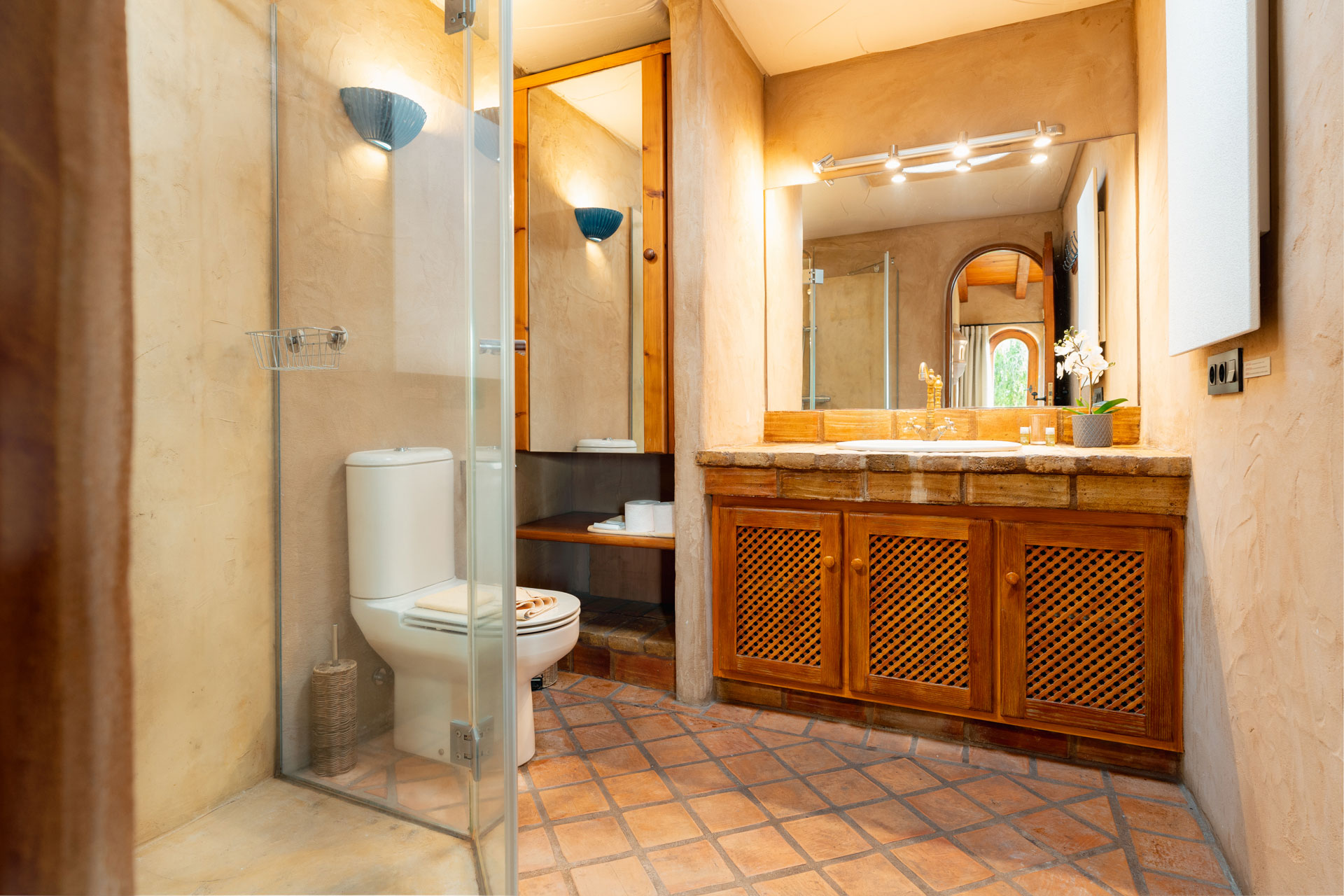 Die eigene Weinbodega mit Grillplatz und einem gemauerten Ofen bietet Platz für 10 Personen. Direkt nebenan befinden sich sozusagen im „Weinkeller“ ein kleines Bad mit Badewanne/WC im ganz rustikalem Stil.