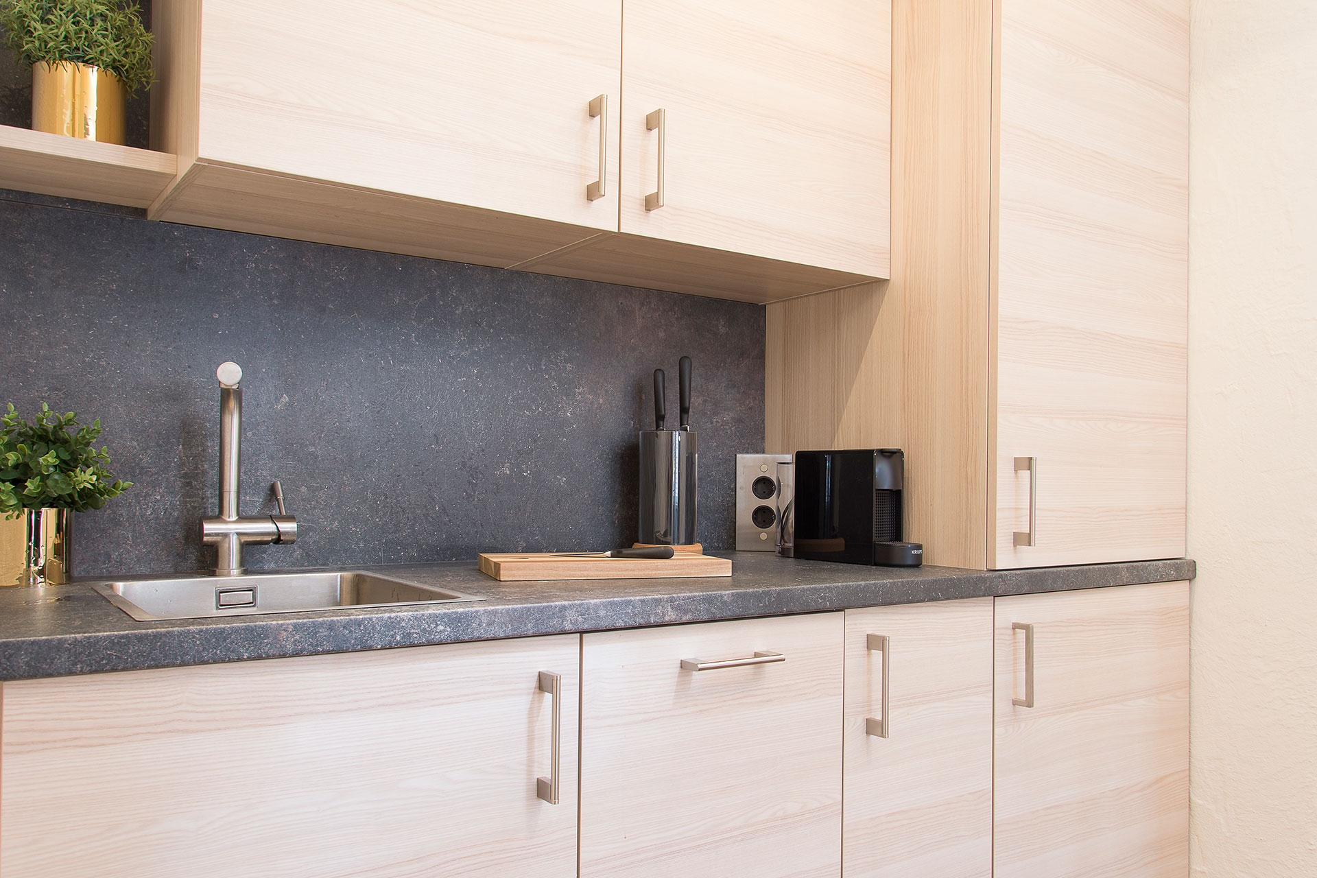 Die marokkanischen Schnitzarbeiten runden das gehobene Ambiente im Schlafzimmer ab. Vom Schlafzimmer gelangen Sie direkt zum eigenen Wasserfall mit Biotop – ein lauschiges Plätzchen das zum Träumen und Verweilen einlädt. Die modern eingerichtete Küche verfügt über Kühlschrank, 4 Platten Cerankochfeld, Backofen, Edelstahldunstabzugshaube, Geschirrspüler, Nespresso Kaffeemaschine, Toaster und alles was man im Urlaub so braucht. Außerdem steht Ihnen ein schönes Dusch-Badezimmer, mit Handtüchern, Bademantel und Haartrockner zur Verfügung, von hier aus haben Sie einen direkten Zugang zum Wellnessbereich.