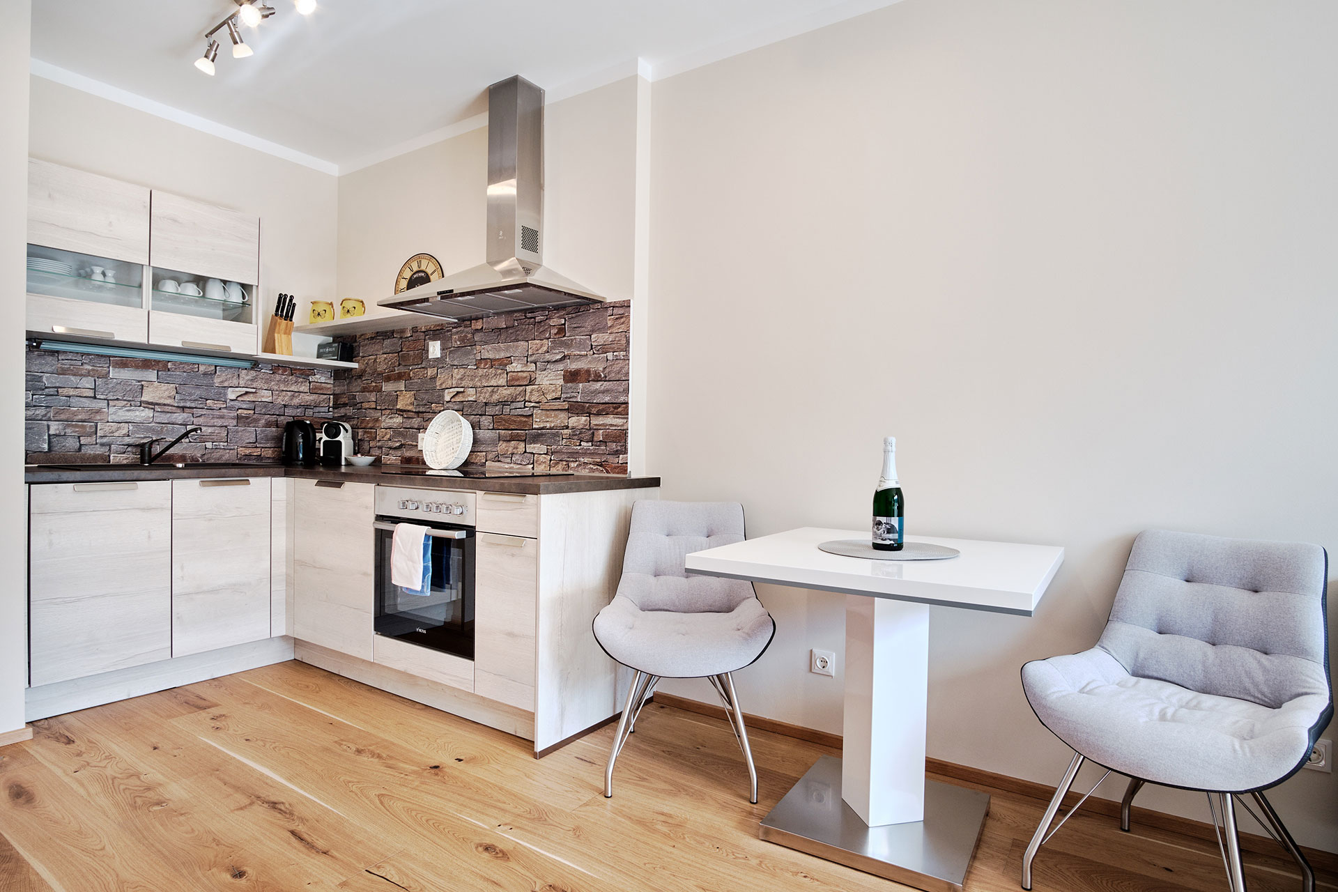Die marokkanischen Schnitzarbeiten runden das gehobene Ambiente im Schlafzimmer ab. Vom Schlafzimmer gelangen Sie direkt zum eigenen Wasserfall mit Biotop – ein lauschiges Plätzchen das zum Träumen und Verweilen einlädt. Die modern eingerichtete Küche verfügt über Kühlschrank, 4 Platten Cerankochfeld, Backofen, Edelstahldunstabzugshaube, Geschirrspüler, Nespresso Kaffeemaschine, Toaster und alles was man im Urlaub so braucht. Außerdem steht Ihnen ein schönes Dusch-Badezimmer, mit Handtüchern, Bademantel und Haartrockner zur Verfügung, von hier aus haben Sie einen direkten Zugang zum Wellnessbereich.