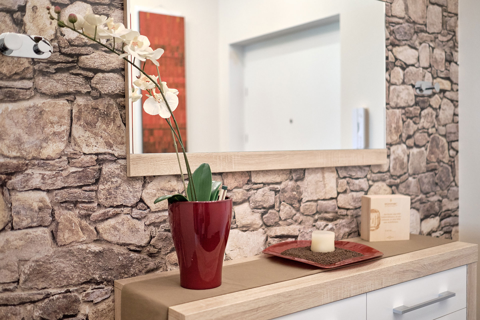 Die marokkanischen Schnitzarbeiten runden das gehobene Ambiente im Schlafzimmer ab. Vom Schlafzimmer gelangen Sie direkt zum eigenen Wasserfall mit Biotop – ein lauschiges Plätzchen das zum Träumen und Verweilen einlädt. Die modern eingerichtete Küche verfügt über Kühlschrank, 4 Platten Cerankochfeld, Backofen, Edelstahldunstabzugshaube, Geschirrspüler, Nespresso Kaffeemaschine, Toaster und alles was man im Urlaub so braucht. Außerdem steht Ihnen ein schönes Dusch-Badezimmer, mit Handtüchern, Bademantel und Haartrockner zur Verfügung, von hier aus haben Sie einen direkten Zugang zum Wellnessbereich.