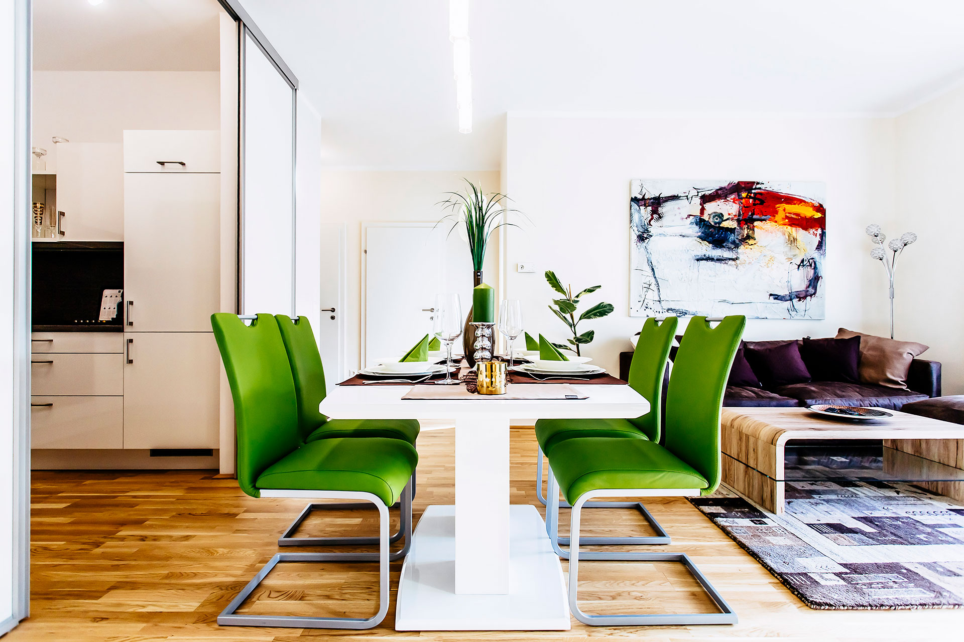 In dem neu gestalteten Esszimmer befindet sich noch ein Komfort Schlafsessel, so dass insgesamt bis zu drei Personen Platz finden.