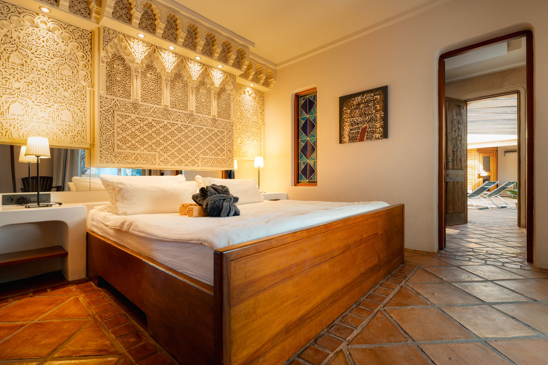 Das „El Teide“ ist die Hochzeitssuite / das Hochzeitspenthaus im „El Refugio“. Vom riesigen Panoramafenster im Schlafzimmer aus sehen Sie den „El Teide“ – den höchsten Berg Spaniens und geniessen einen fantastischen Blick auf das Meer. Der Blick auf die gesamte Nordküste, und deren Lichtermeer bei Nacht ist eine perfekte Untermalung für romantische Stunden. Das großzügige Schlafzimmer verfügt über ein Doppelbett samt Swiss-Flex-Gesundheitsschlafsystem und ein hochwertiges Sofa. Die marokkanischen Schnitzarbeiten runden das gehobene Ambiente in dem Wohn- / Schlafzimmer ab. Ein Smart SAT-TV, ermöglicht den Empfang der ASTRA-Fernseh- und Radiokanäle (u.a. auch einige englisch und französisch sprachige).