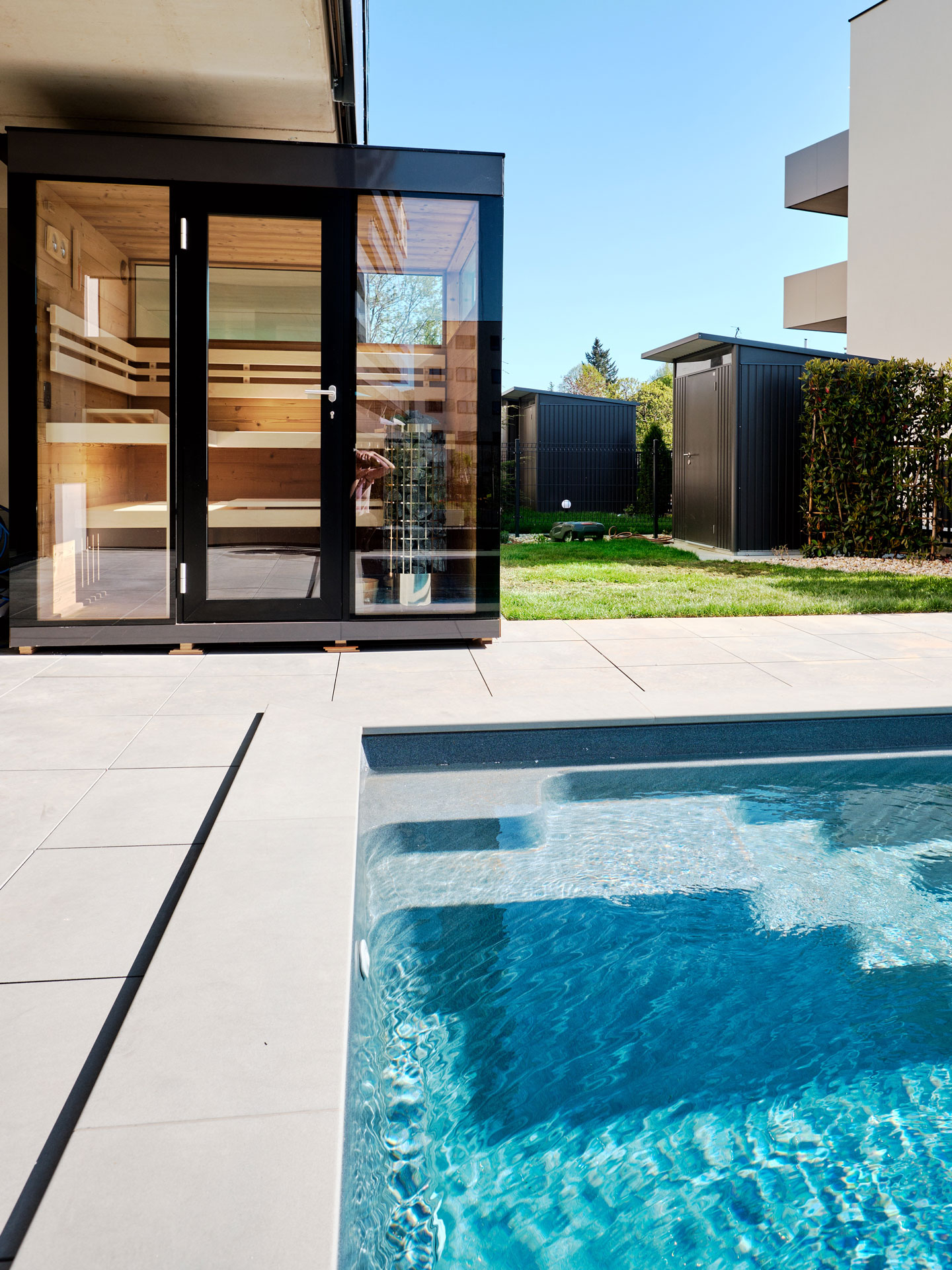 Der Wellnessbereich mit Hallenbad und Sauna ist über eine geschwungene Treppe durch den Garten erreichbar.