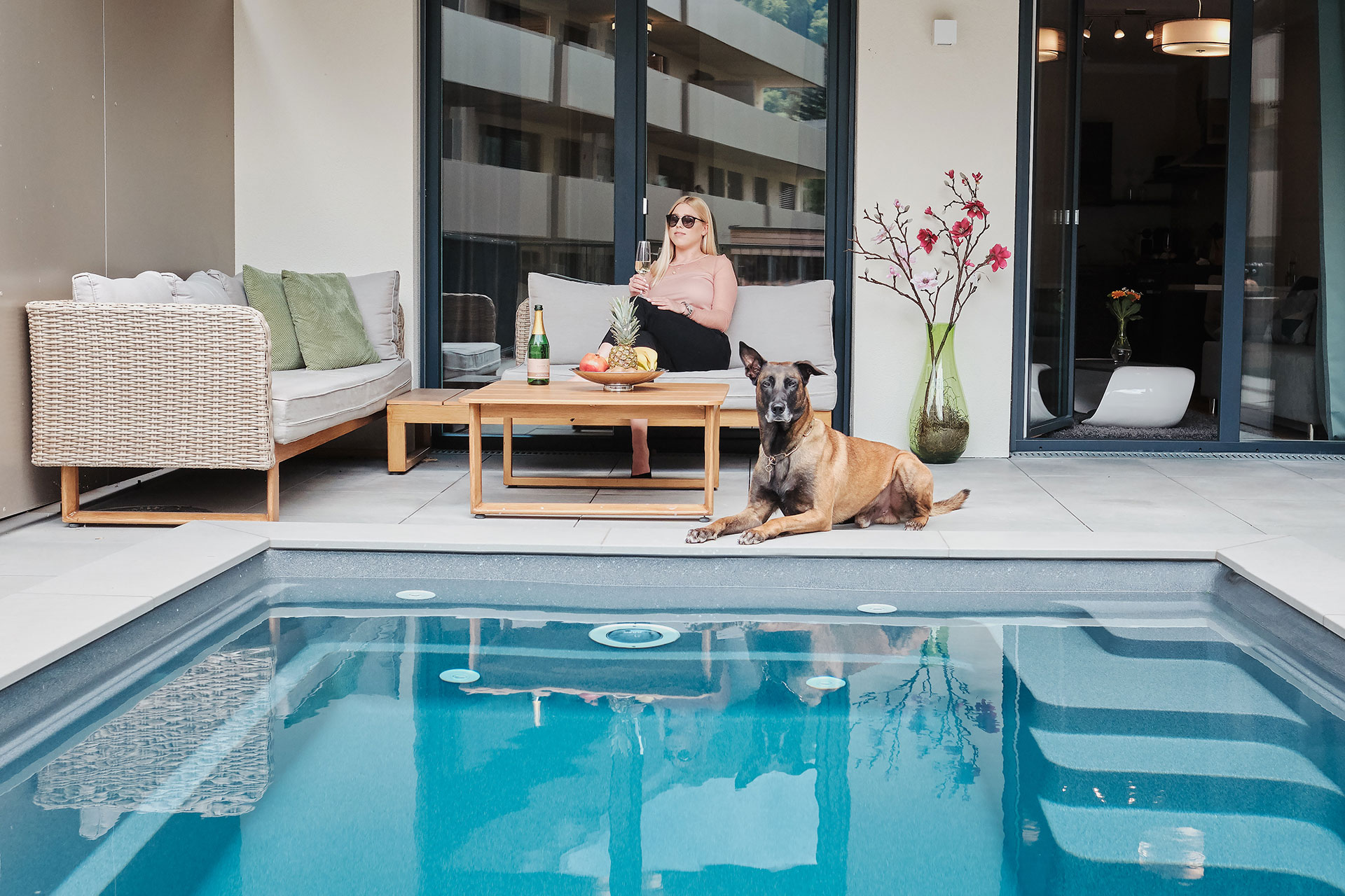 Der Wellnessbereich mit Hallenbad ist über eine großzügige Aussentreppe erreichbar. Direkt angrenzend befindet sich eine Sonnenwiese oder ein lauschiges Plätzchen unter Palmen.