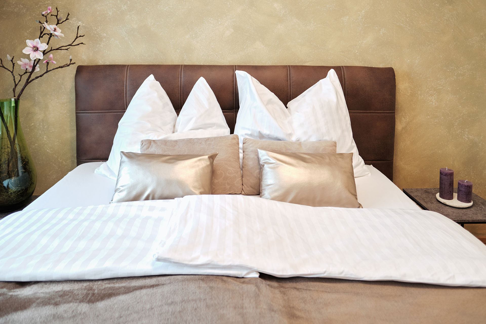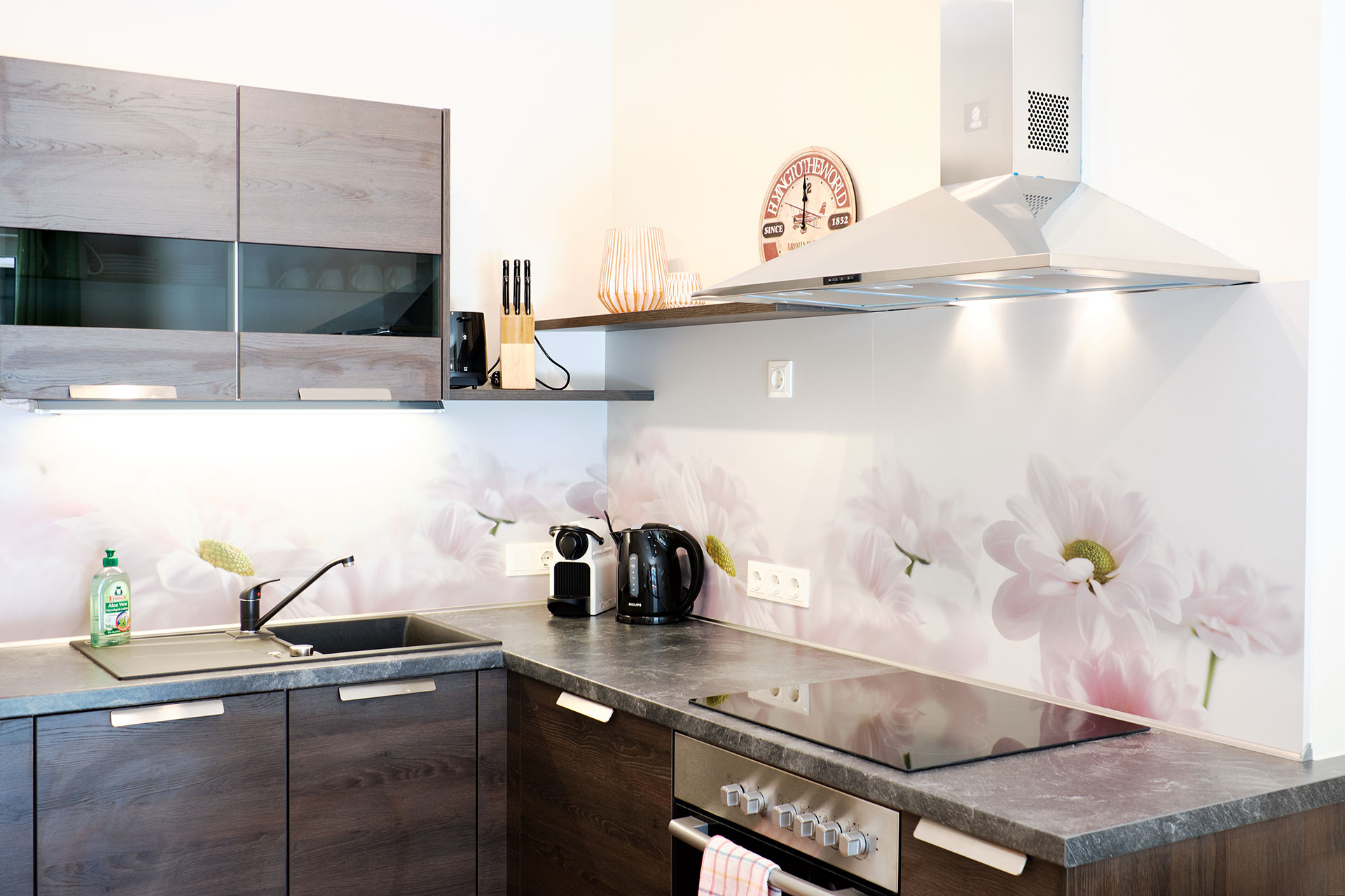 Die marokkanischen Schnitzarbeiten runden das gehobene Ambiente im Schlafzimmer ab. Vom Schlafzimmer gelangen Sie direkt zum eigenen Wasserfall mit Biotop – ein lauschiges Plätzchen das zum Träumen und Verweilen einlädt. Die modern eingerichtete Küche verfügt über Kühlschrank, 4 Platten Cerankochfeld, Backofen, Edelstahldunstabzugshaube, Geschirrspüler, Nespresso Kaffeemaschine, Toaster und alles was man im Urlaub so braucht. Außerdem steht Ihnen ein schönes Dusch-Badezimmer, mit Handtüchern, Bademantel und Haartrockner zur Verfügung, von hier aus haben Sie einen direkten Zugang zum Wellnessbereich.