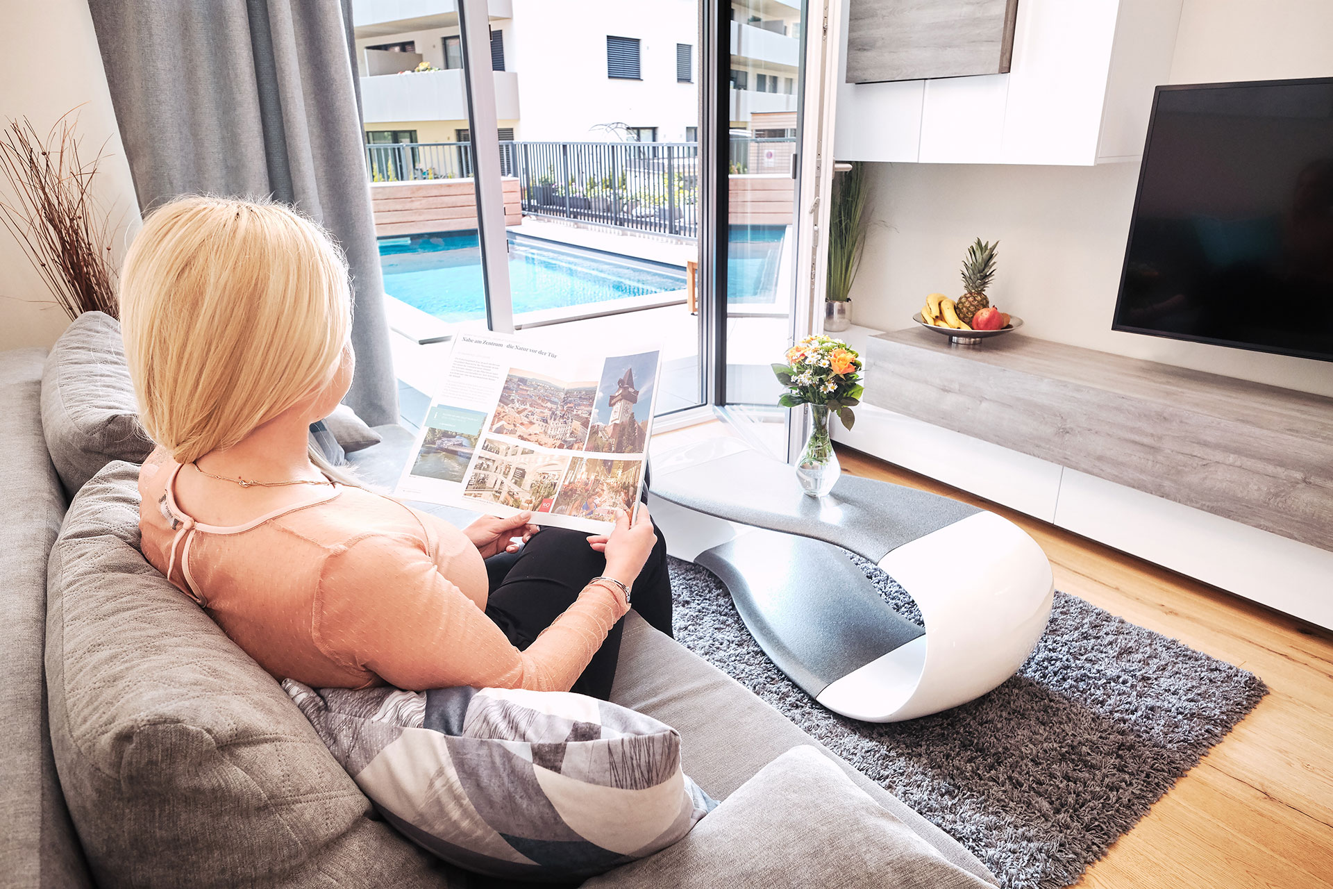 Die Pool Suite Ferdinand lässt mit ihrer großzügigen Terrasse und ihrem Außenpool keine Wünsche offen. Sie kann auf 62 m² bis zu 4 Personen einen erholsamen Urlaub bieten. Genießen Sie das Grazer Cityfeeling das ganze Jahr über und gönnen Sie sich heiße Saunagänge in der Außensauna und abkühlende Sprünge in das Außenpool. Im Winter ist das Außenpool leicht beheizt (max. 25 Grad).