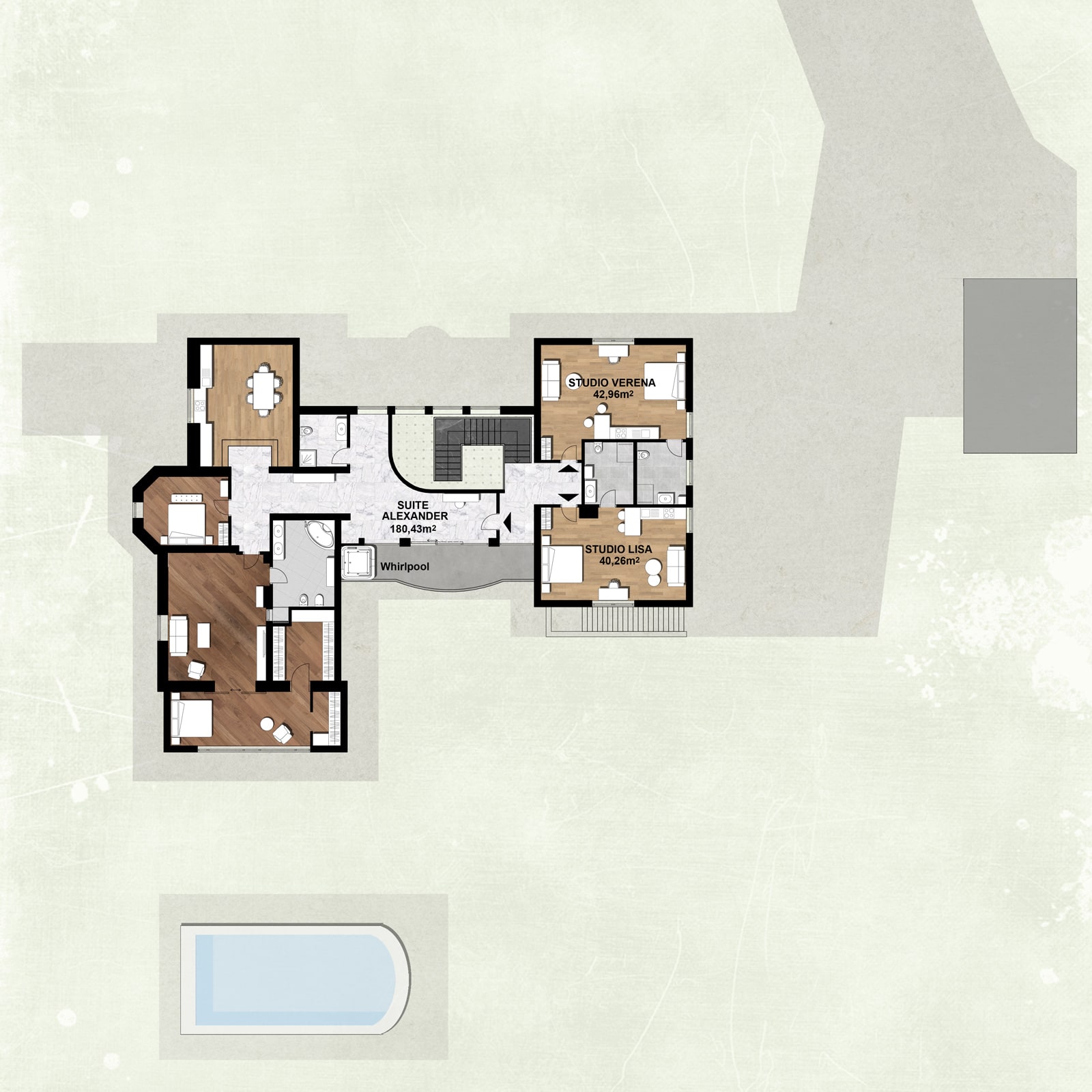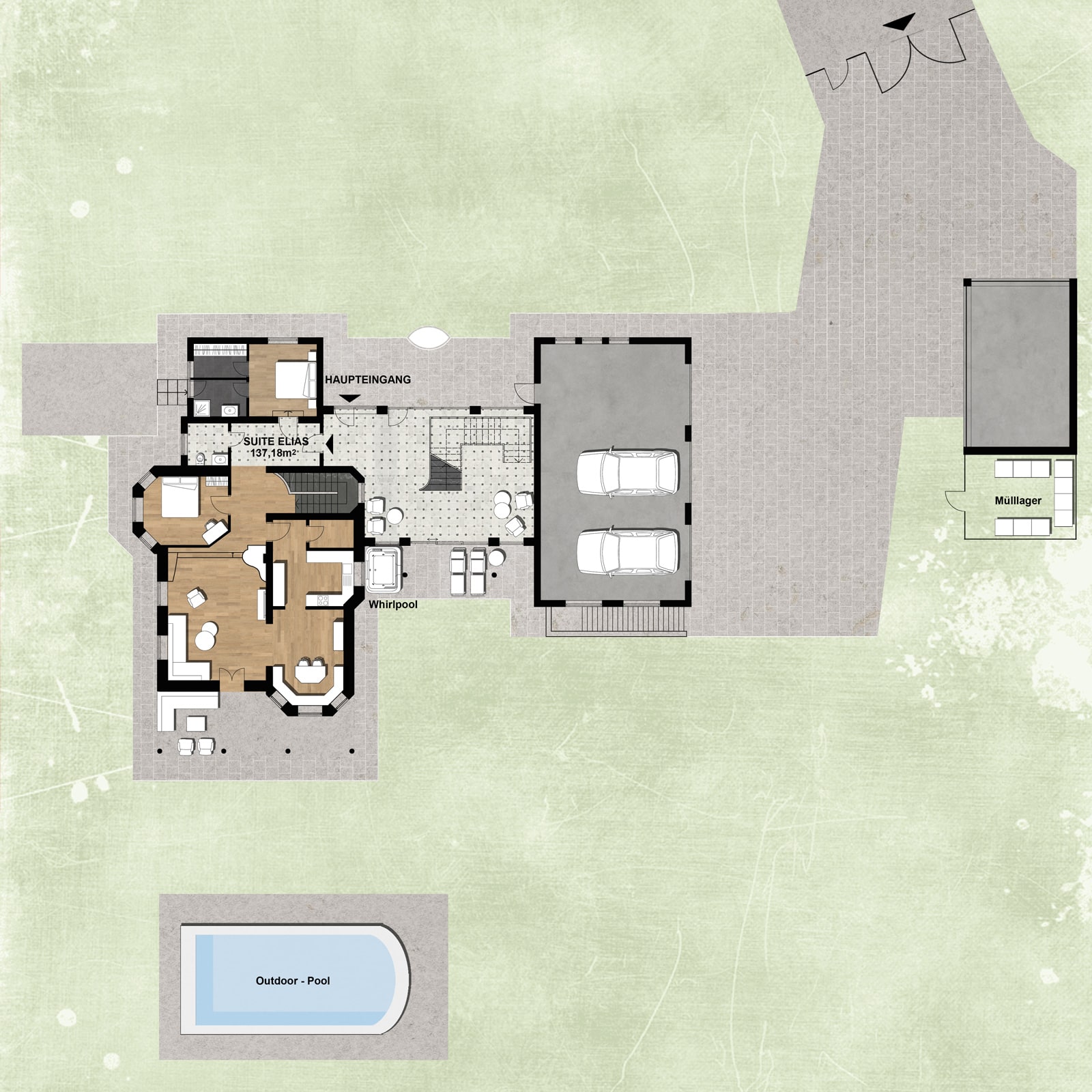 Der Wellnessbereich mit Hallenbad ist über eine großzügige Aussentreppe erreichbar. Direkt angrenzend befindet sich eine Sonnenwiese oder ein lauschiges Plätzchen unter Palmen.