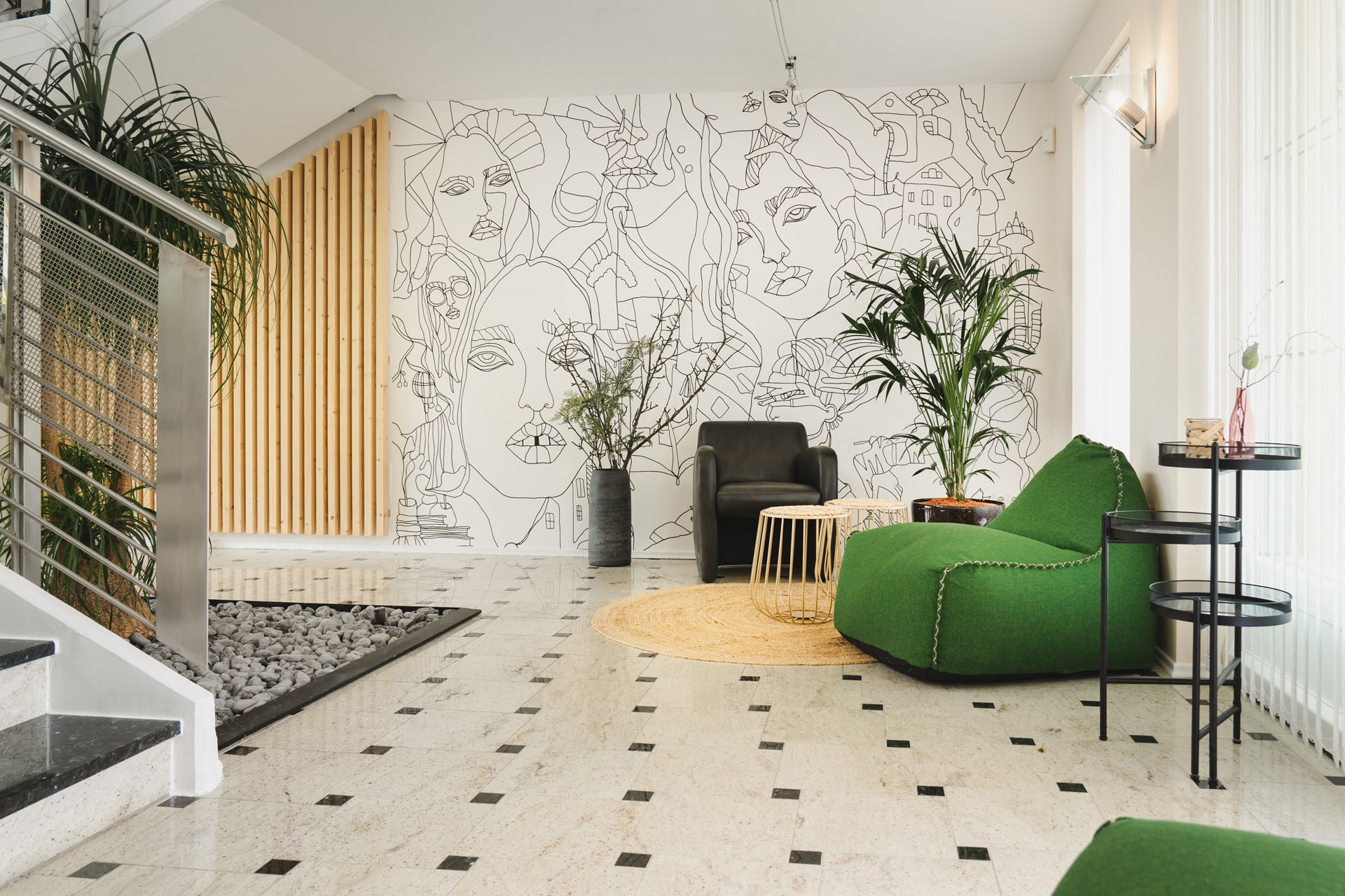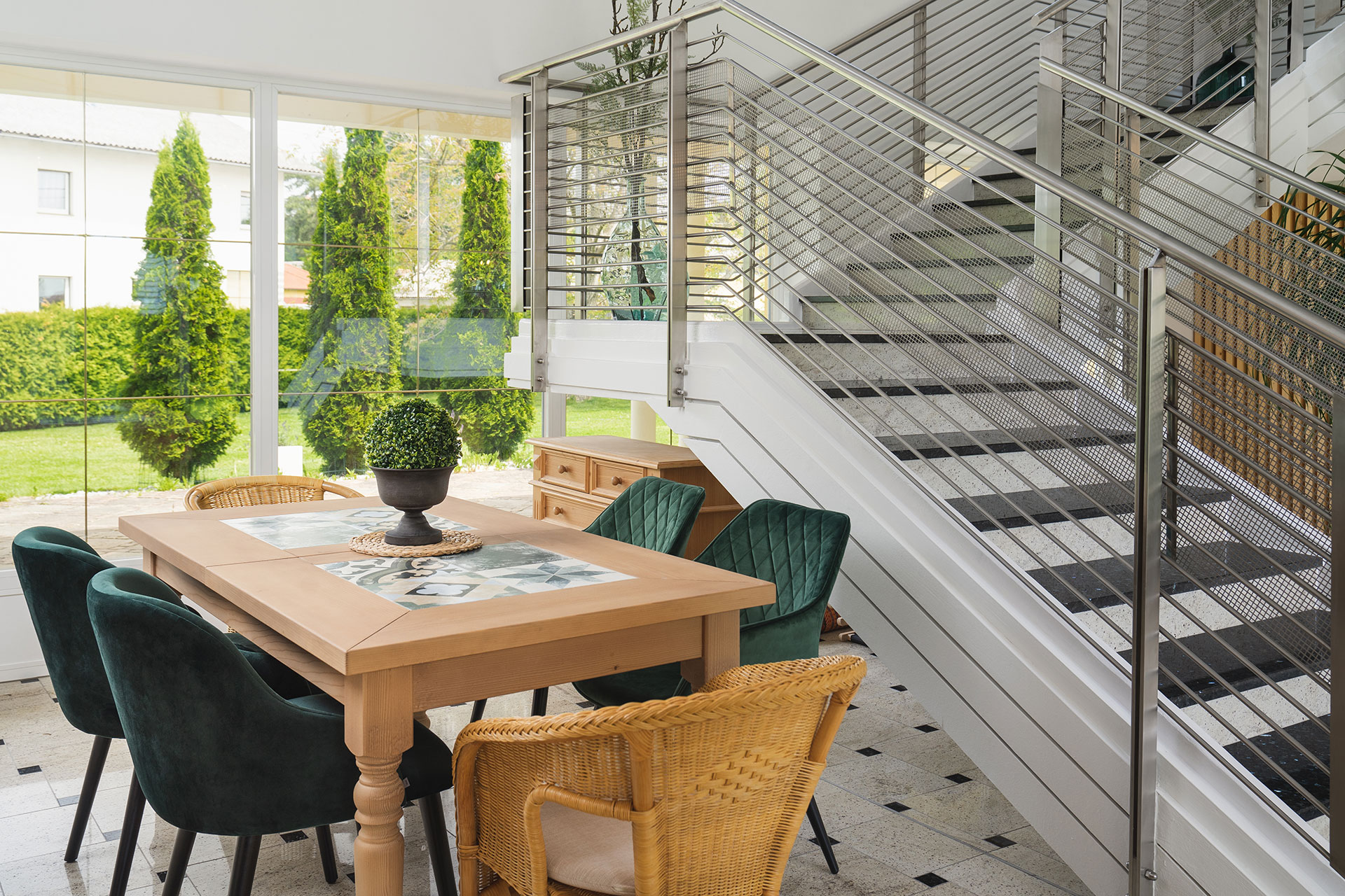 Der Wellnessbereich mit Hallenbad und Sauna ist über eine geschwungene Treppe durch den Garten erreichbar.