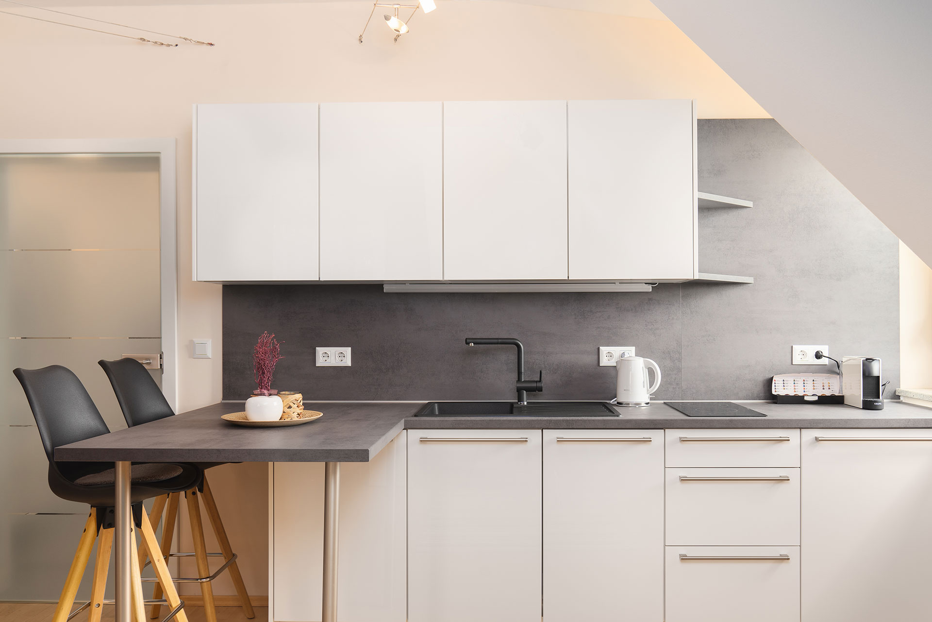 Die Küche ist voll eingerichtet und verfügt über ein 4-Platten-Cerankochfeld, Backofen, Geschirrspüler, Nespresso-Kaffemaschine, Kühlschrank und alles was man im Urlaub braucht. Das Duschbad verfügt über eine begehbare Dusche und WC. Haartrockner, Handtücher und Bademäntel sind vorhanden.