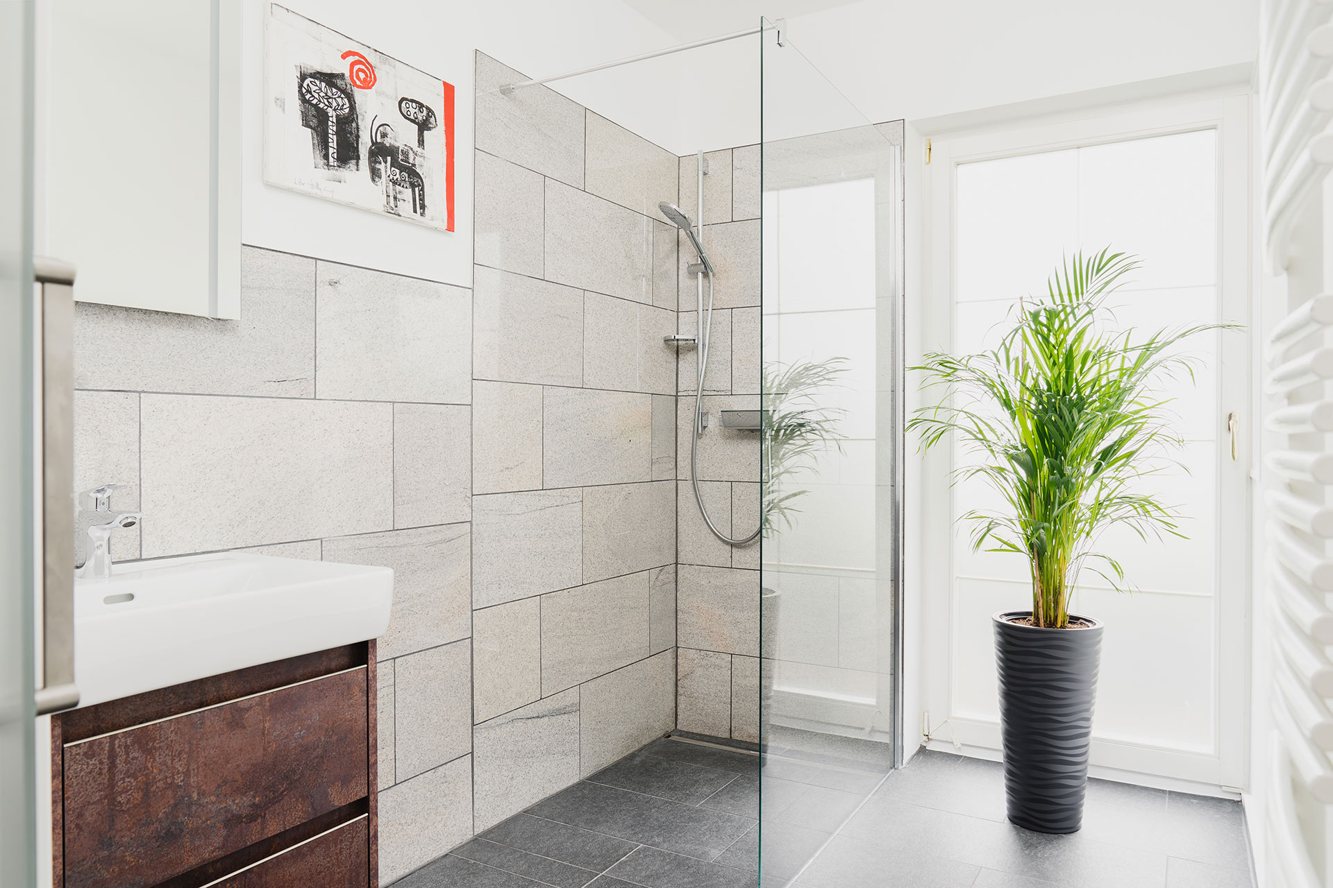 Die marokkanischen Schnitzarbeiten runden das gehobene Ambiente im Schlafzimmer ab. Vom Schlafzimmer gelangen Sie direkt zum eigenen Wasserfall mit Biotop – ein lauschiges Plätzchen das zum Träumen und Verweilen einlädt. Die modern eingerichtete Küche verfügt über Kühlschrank, 4 Platten Cerankochfeld, Backofen, Edelstahldunstabzugshaube, Geschirrspüler, Nespresso Kaffeemaschine, Toaster und alles was man im Urlaub so braucht. Außerdem steht Ihnen ein schönes Dusch-Badezimmer, mit Handtüchern, Bademantel und Haartrockner zur Verfügung, von hier aus haben Sie einen direkten Zugang zum Wellnessbereich.